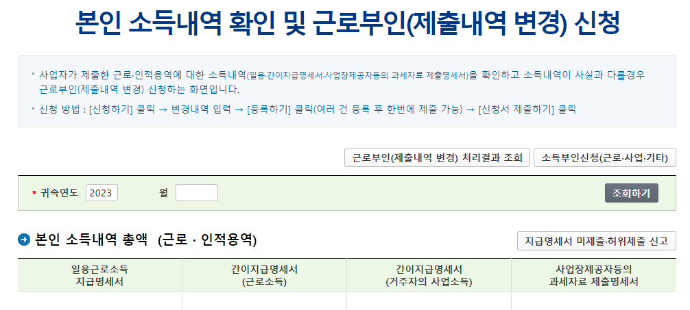 지급명세서 클릭하시고 소득자료제출 부분의 본인소득내역 확인 및 근로부인 신청을 클릭하시면 소득내역확인화면으로 들어갑니다.
